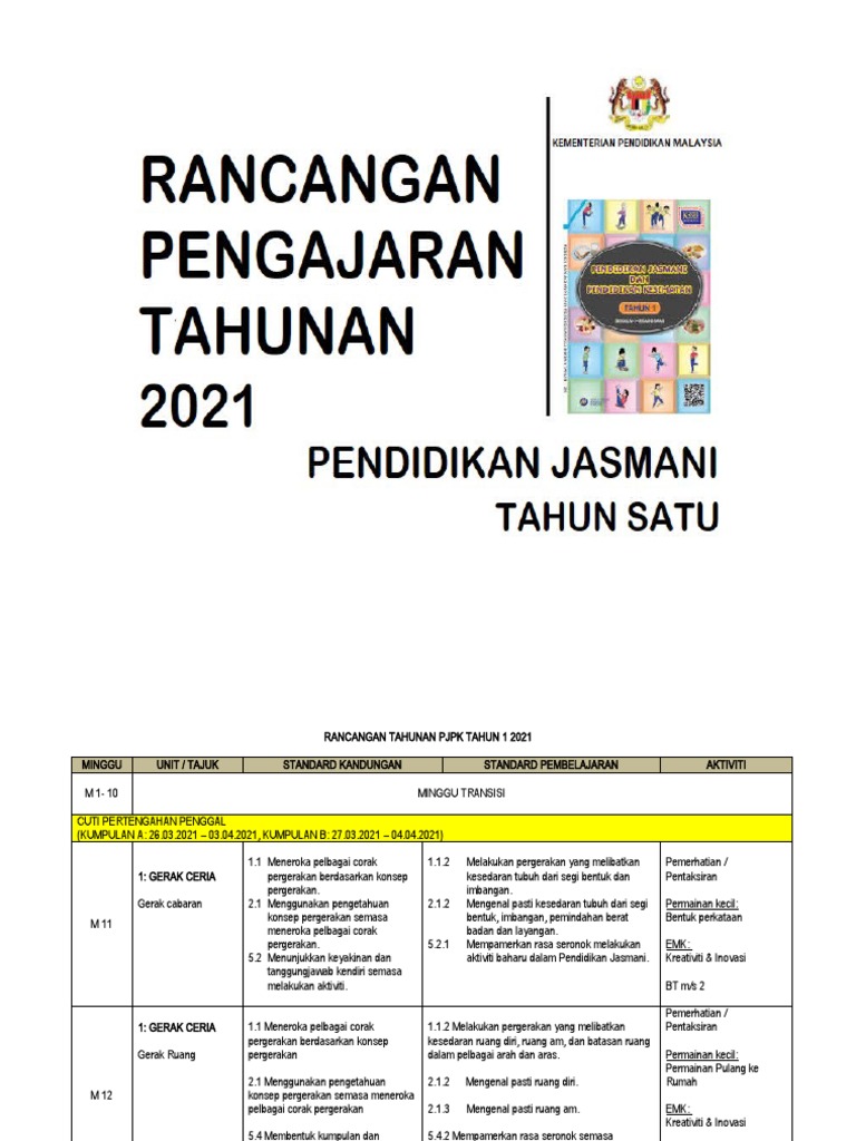 Himpunan RPT KSSR Tahun 1 20222023 mengandungi keseluruhan RPT untuk semua subjek untuk Tahun 1Rancangan Pelajaran Tahuan adalah dokumen secara ringkas isi pengajaran dan pelan proses mengajar PP secara bertulis berdasarkan Dokumen Standard Kurikulum dan Pentaksiran DSKP yang dikeluarkan oleh Kementerian Pelajaran Malaysia. Murid membentuk formasi badan seperti gergasi. RANCANGAN TAHUNAN PENDIDIKAN JASMANI TAHUN 1 2013 STANDARD MG FOKUS STANDARD PEMBELAJARAN CATATANEMK KANDUNGAN 01 Transisi 02 Transisi 03 Transisi Kesedaran Tubuh Konsep Pergerakan Pemerhatian 04 111 Melakukan pergerakan yang Badan melibatkan kesedaran tubuh dari Pentaksiran Contoh aktiviti.